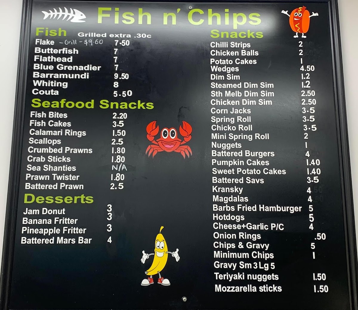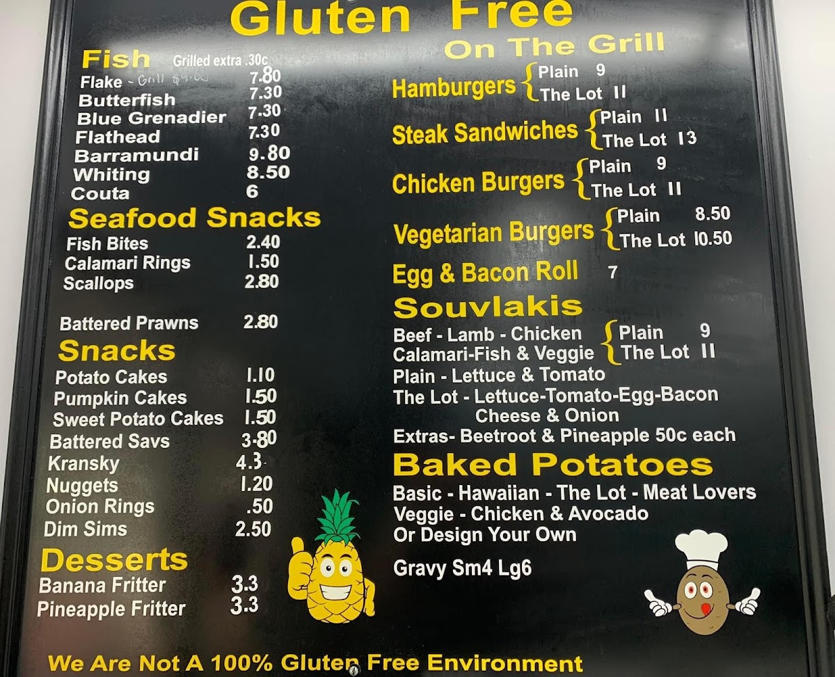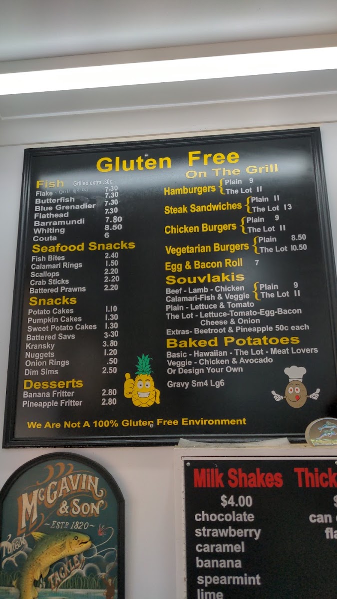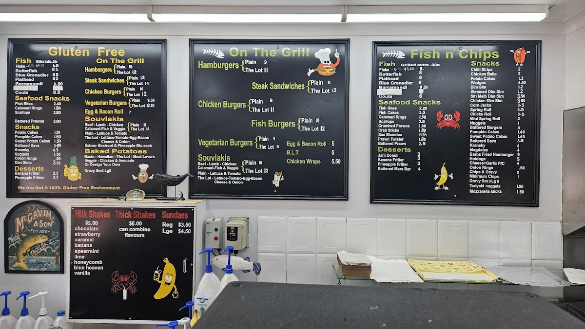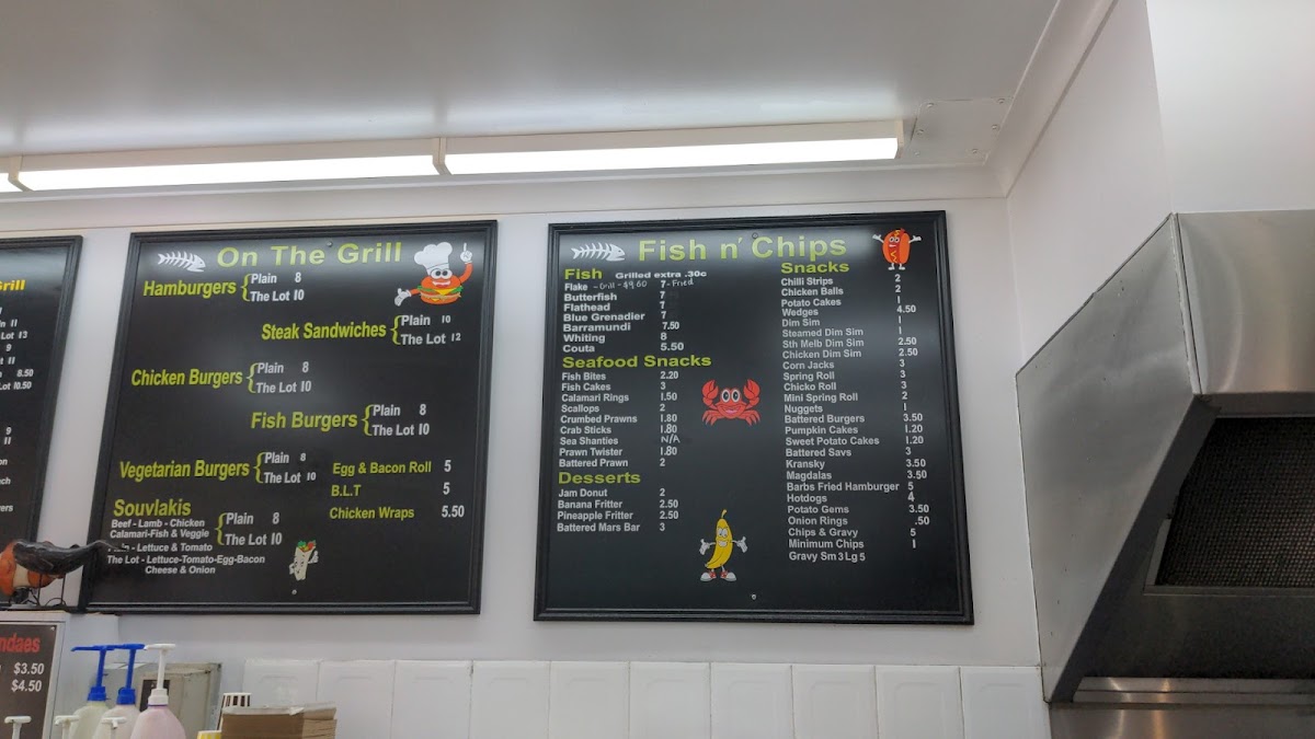 The menu at Northpoint Fish & Chips offers a delightful variety of dishes, perfect for satisfying any craving. Their fish selection features fresh options such as Flake, Butterfish, Flathead, Blue Grenadier, and Barramundi. For those seeking lighter bites, the Snacks section includes Chilli Strips, Chicken Balls, Potato Cakes, Wedges, and Dim Sims. Seafood enthusiasts will love the Fish Bites, Fish Cakes, Calamari Rings, Scallops, and Crumbed Prawns available in the Seafood Snacks category. For dessert, there are indulgent options like the Jam Donut, Banana Fritter, Pineapple Fritter, and the ever-popular Battered Mars Bar. If you're in the mood for a cool treat, the Milk Shakes come in a variety of flavors such as Chocolate, Strawberry, Caramel, Banana, and Spearmint. The Baked Potatoes are available in a tasty Veggie option, while the On The Grill section includes classic favorites like Hamburgers. Other menu highlights include Teriyaki Nuggets, Mozzarella Sticks, Egg & Bacon Roll, Chicken Wraps, and Steak Sandwiches. This diverse and appetizing menu makes Northpoint Fish & Chips a go-to spot for both seafood lovers and those looking for a hearty meal.